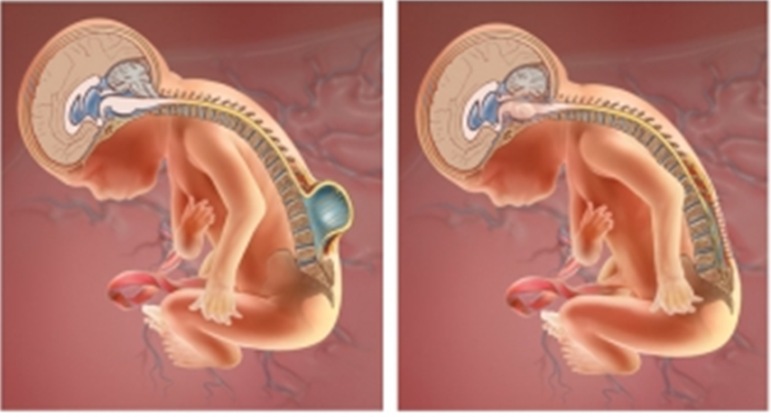 La forma más común y grave de espina bífida es el mielomeningocele (MMC), en la cual una parte de la médula espinal y los nervios que la rodean atraviesan los huesos abiertos (vértebras) en la columna y salen a través de la espalda del feto. Por lo general, la médula espinal y los nervios expuestos están contenidos en un saco que está expuesto al líquido amniótico. Se cree que el contacto continuo de los frágiles nervios de la médula espinal en desarrollo, con el líquido amniótico durante el transcurso de la gestación, y el impacto continuo de estos con la pared uterina, resulta en lesiones neurológicas progresivas e irreversibles. Hasta hace poco, el tratamiento de la espina bífida se limitaba a la reparación de defecto a las pocas horas del nacimiento, sin embargo el daño sobre los nervios y la hidrocefalia ya estaban presentes.